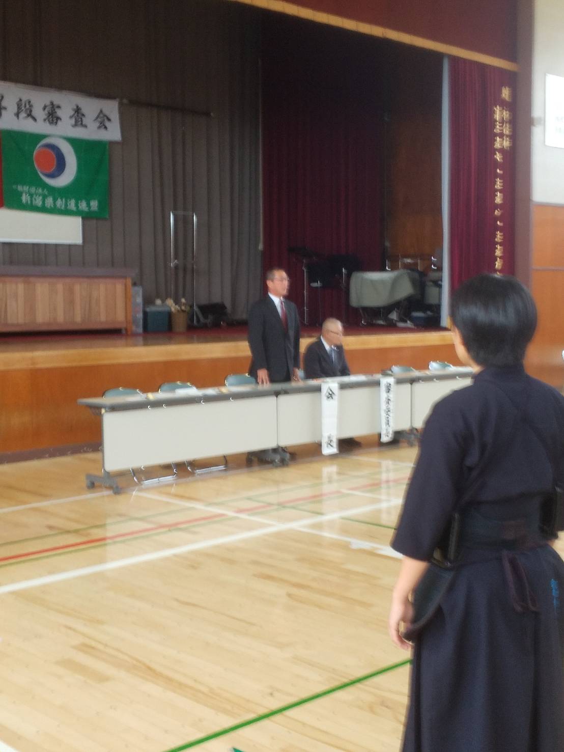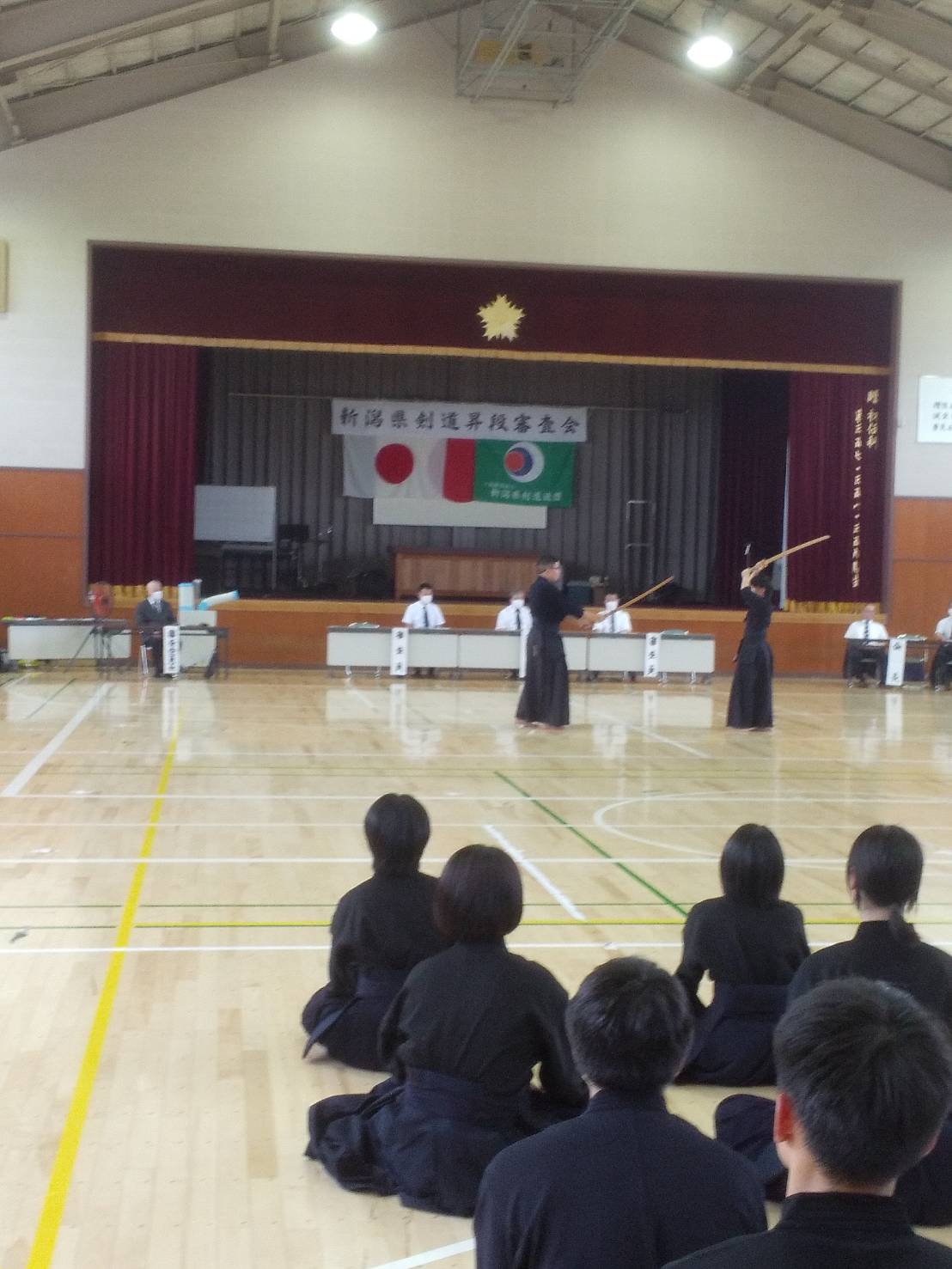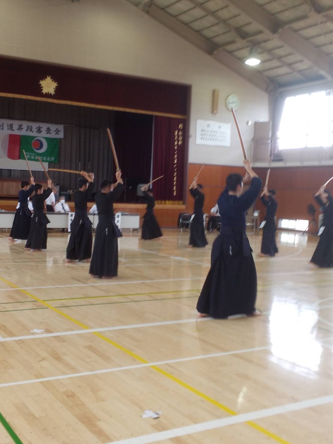 県警察剣道連盟主管に於ける新潟県剣道連盟の昇段審査会初段から三段まで行われ初段53名・二段9名・三段2名の受審者がありました、初、二段につきましては迫力満点で気力も充分で全員昇段と成りました。