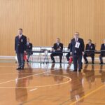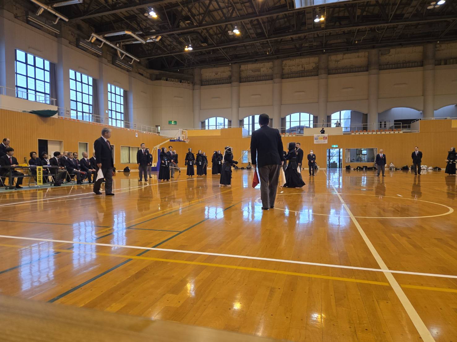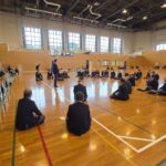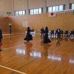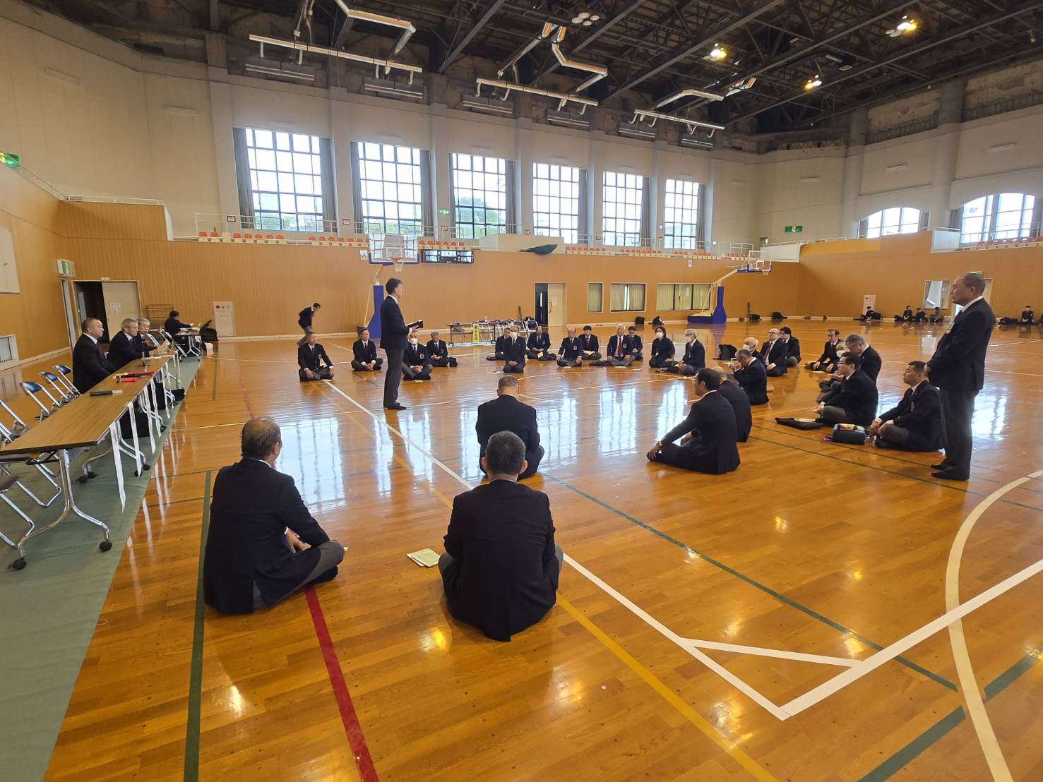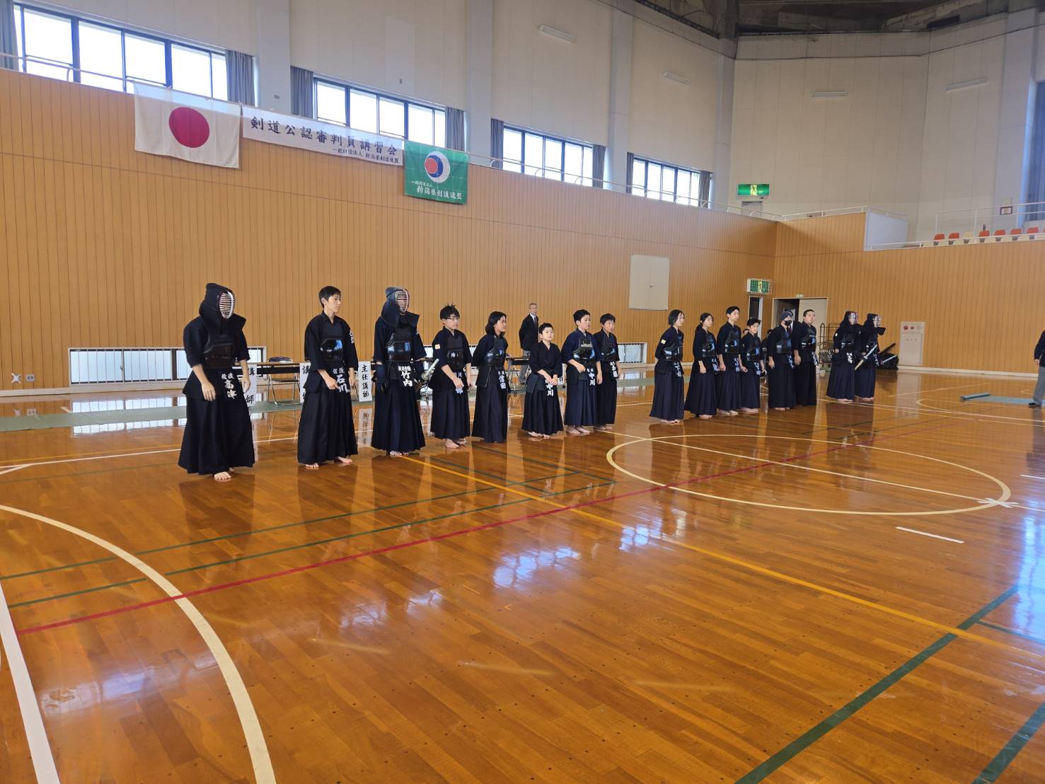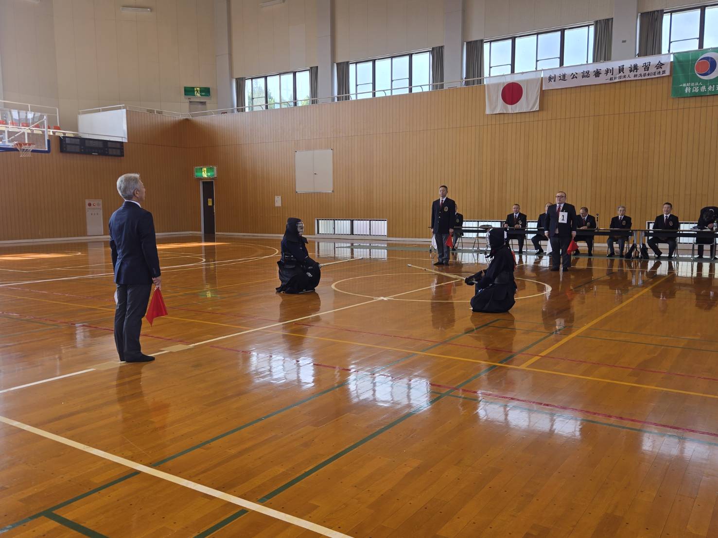 吉田仁主任講師による講話の後実技講習を行った。試合者は地元生徒が担い、受講者は全員が主審、副審を務めた。